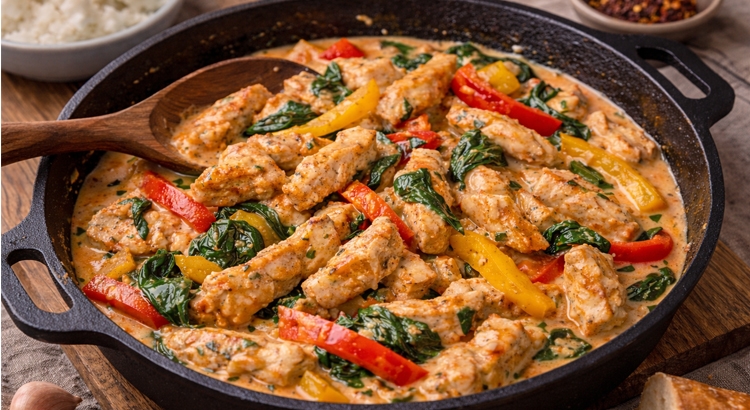 4 Afmaken: Doe de kip terug in de pan. Voeg spinazie toe en laat slinken. Laat nog 3–4 minuten zacht pruttelen tot alles gaar en romig is.