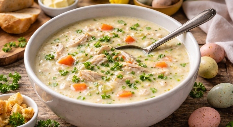 5 Bouillon toevoegen: Schenk beetje bij beetje de warme kippenbouillon erbij terwijl je goed blijft roeren. Zo ontstaat een licht gebonden soep.