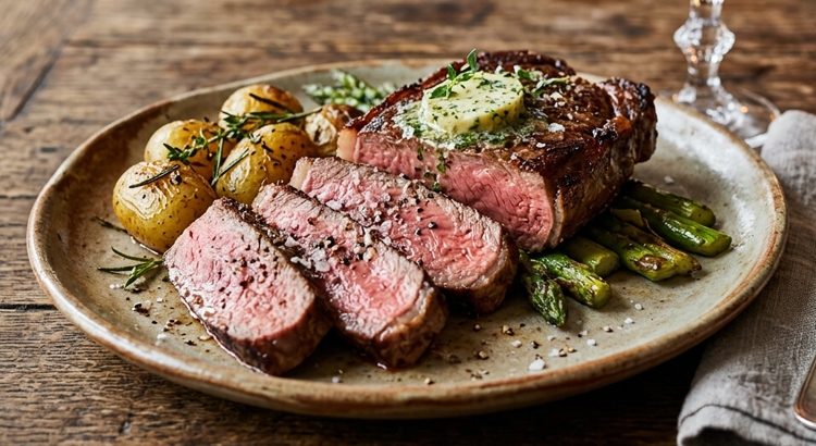 Leg de kogelbiefstuk op het bord en leg er een plakje knoflookboter bovenop zodat deze langzaam smelt. Serveer met de gebakken krieltjes en groene asperges.